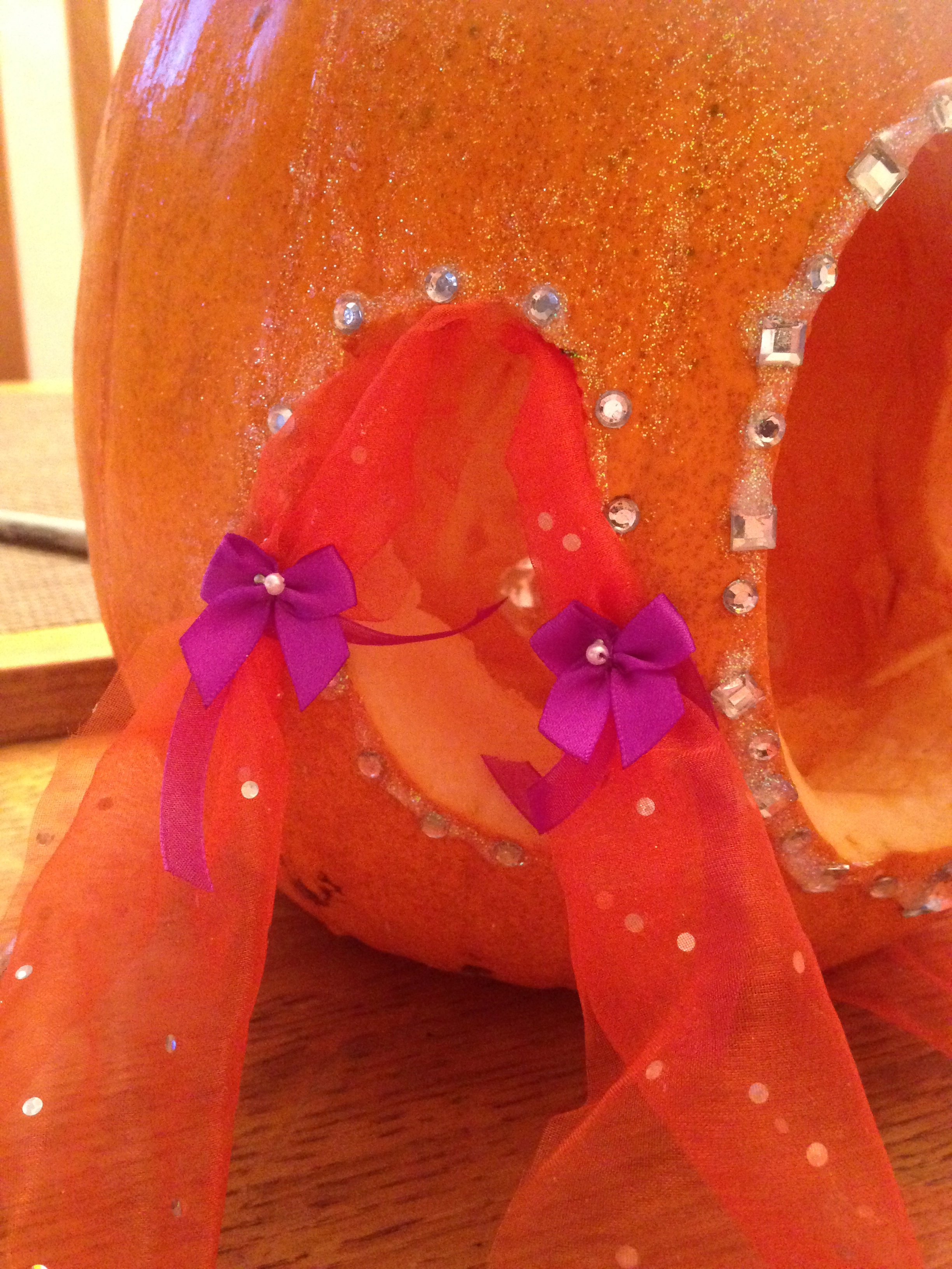 Back to the Pumpkin pimping. Using a household paint brush , I coated the outside of the pumpkin with orange glitter glue. Hello fire hazard. I then used some old strass/diamanté/beads that I had lying around in my room to decorate around the ‘windows’ and ‘door’. The little orange curtains are made from organza, which originally came from a flower bouquet. (I buy all the flower bouquets) The purple ribbons and bows cost about £1.50 from a local craft shop. All the material and bows were pinned on. This carriage concept is a great activity to carry out with little girls (or boys who want to turn their halloween pumpkin into a death wagon) however it’s imperative to make sure that children are supervised around flames and pins. Because nobody wants a paint splattered screaming child with a pin through their eye and a flaming hand. It’s also best to let an adult do the carving. You get the picture.