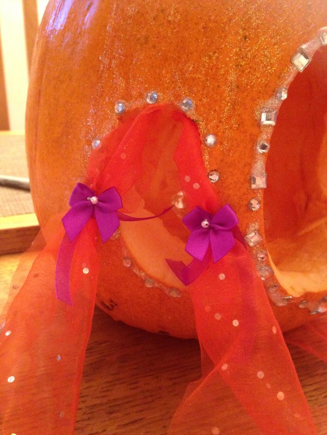 And here is the finished result. I added an old glittery tiara from Claire’s Accessories on top (originally from a cheerleading gypsy wedding social) and used two smaller pumpkins for the wheels – they’re not overly sophisticated, I may alter them. The large pumpkin is actually supported underneath by a bowl which has been covered in the glittery orange organza.